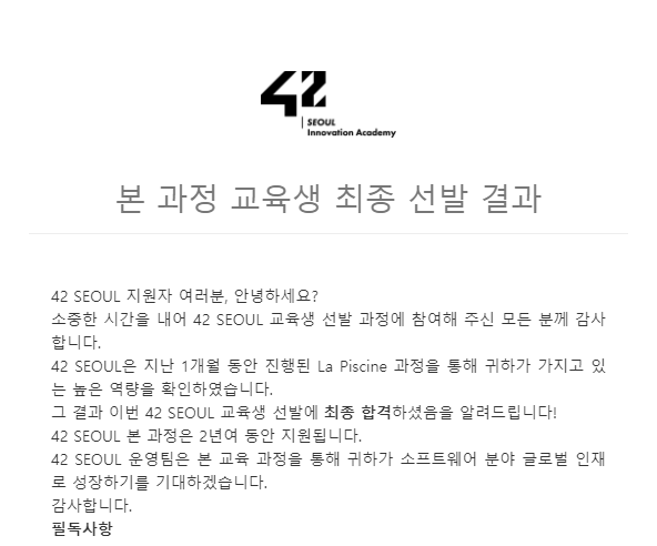 그러던 중, 1년 전에 신청해놨던 42서울 라피신 과정 참가 이메일을 받게 됐습니다. 당시 4학년 막 학기 중이었습니다. 마침 8학점만 수강하던 상황이라 42서울에 운이 좋게 참가를 하게 됐습니다. 지금 생각해보면 정말 운이 좋았네요. 졸업을 하자마자 42서울을 참가할 수 있었으니깐요.