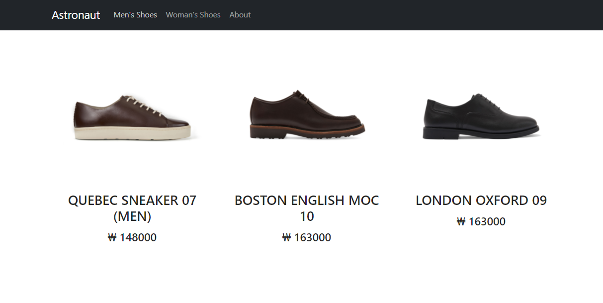 그런데 메인 페이지에 신발 상품이 들어가는 것이 별로 이쁘진 않았다. 그리고 메인 페이지에서 Navbar를 만들어 각각의 상품 카테고리별로 라우팅하게 했고, 해당 데이터를 ShoesItem이 전달받게 했다.