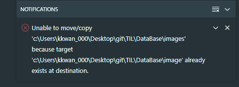 그랬더니 세상에...... 되는 경우와 안되는 경우가 있었는데 내가 정말 멍청하게도 vscode를 맹신하고 있었던 것이다아아아아.... 다른 git에서는 images 라는 디렉터리안에 이미지 파일이 있었고 문제가 생긴 git쪽에서는 image로 디렉터리 이름이 설정 돼 있었다. 그래서 s 차이가 문제를 일으킨건가...? 하고 혹시나해서 디렉터리 이름을 바꾸려 했지만 오류가 발생했다. 그래서 디렉터리를 삭제하고 새로운 images를 만들고 이미지 업로드가 되는 것을 확인 후, 다시 image로 바꾸었는데 이런 오류가 발생했다.