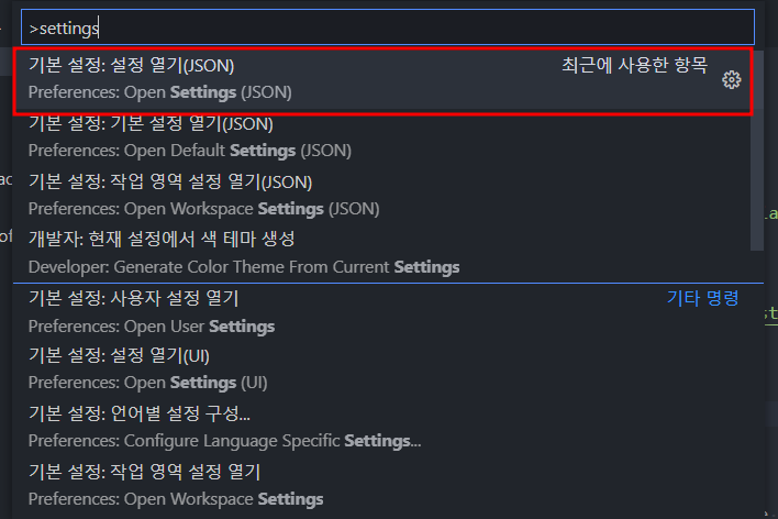 이 글을 읽고나서 혹시나 해서 나의 setting.json을 찾아봤다. F1 key > settings 입력 후 색칠된 메뉴 클릭